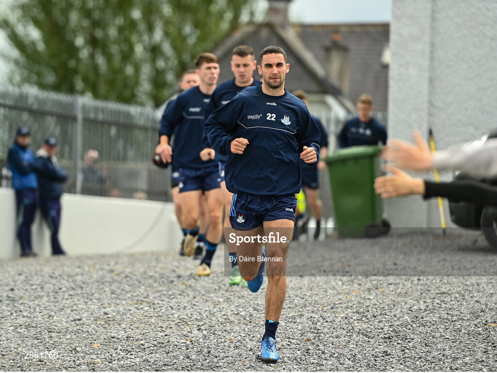 16 June 2024; Dublin captain James McCarthy leads his side out ahead of the GAA Football All-Ireland Senior Championship Round 3 match between Dublin and Mayo at Dr Hyde Park in Roscommon. Photo by Daire Brennan/Sportsfile