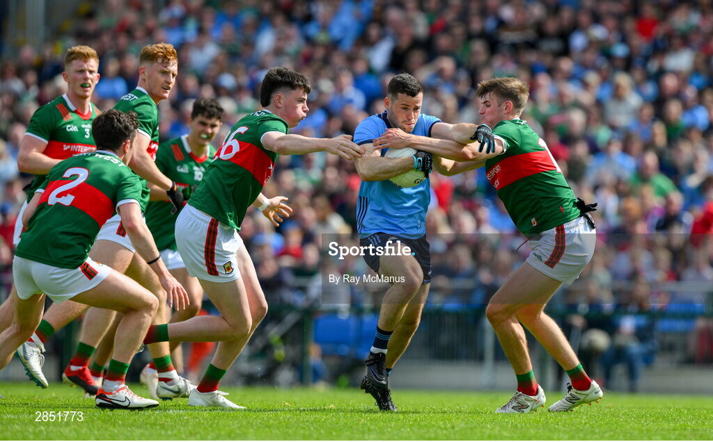 16 June 2024; Ross McGarry of Dublin is tackled by Bob Tuohy, 26, and Rory Brickenden of Mayo during the GAA Football All-Ireland Senior Championship Round 3 match between Dublin and Mayo at Dr Hyde Park in Roscommon. Photo by Ray McManus/Sportsfile