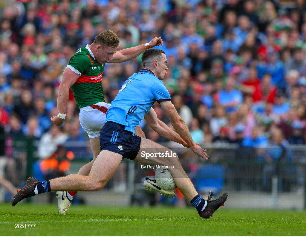 16 June 2024; Ryan O'Donoghue of Mayo has a shot on goal blocked by Brian Fenton of Dublin during the GAA Football All-Ireland Senior Championship Round 3 match between Dublin and Mayo at Dr Hyde Park in Roscommon. Photo by Ray McManus/Sportsfile