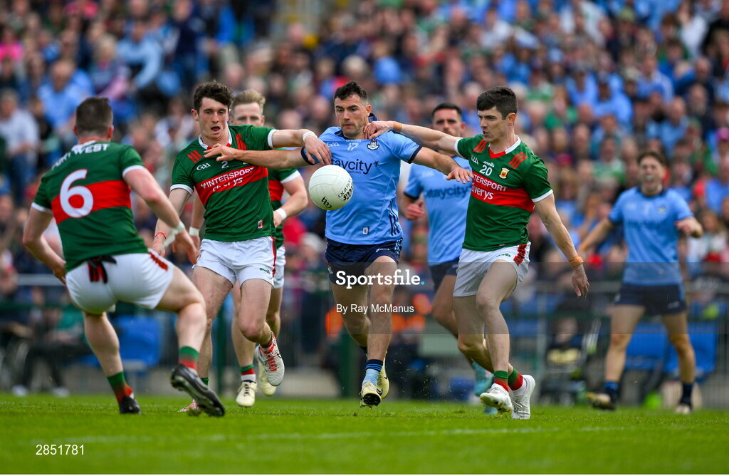 16 June 2024; Colm Basquel of Dublin is tackled by Jack Coyne, left, and Conor Loftus of Mayo during the GAA Football All-Ireland Senior Championship Round 3 match between Dublin and Mayo at Dr Hyde Park in Roscommon. Photo by Ray McManus/Sportsfile