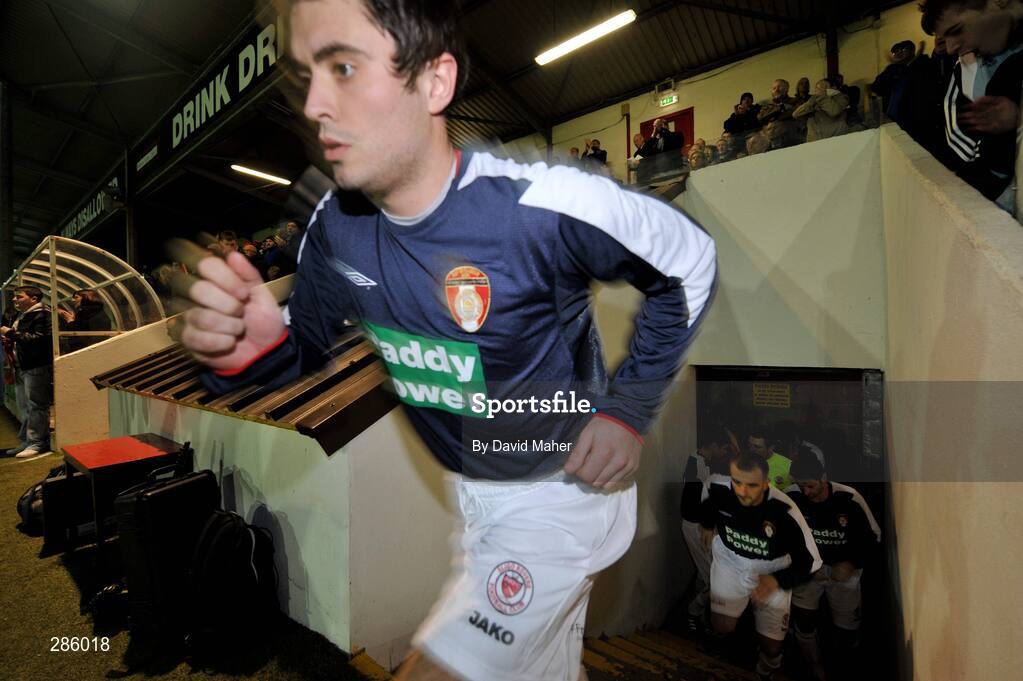 7 March 2008; Sean Doherty, Sligo Rovers runs out onto the pitch after a 30 minute delay to the start of the game wearing a St. Patrick's Athletic away strip, referee Anthony Buttmer would not allow the game to start due to similar strips on both teams. eircom League of Ireland Premier Division, St. Patrick's Athletic v Sligo Rovers, Richmond Park, Inchicore, Dublin. Picture credit; David Maher / SPORTSFILE