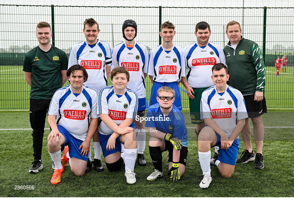 29 June 2024; The Leinster North B team pose for a team photograph before the FAI Football For All Interprovincial Games at Evergreen FC in Kilkenny. The FAI Football For All programme was initiated to assist and develop opportunities for players of all ages with a disability in their local community. Photo by Seb Daly/Sportsfile