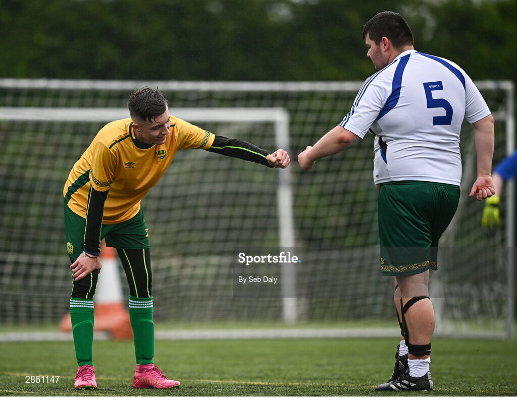 29 June 2024; Jakes Byrnes of Leinster North A and Michael Brophy of Leinster North B during the FAI Football For All Interprovincial Games at Evergreen FC in Kilkenny. The FAI Football For All programme was initiated to assist and develop opportunities for players of all ages with a disability in their local community. Photo by Seb Daly/Sportsfile