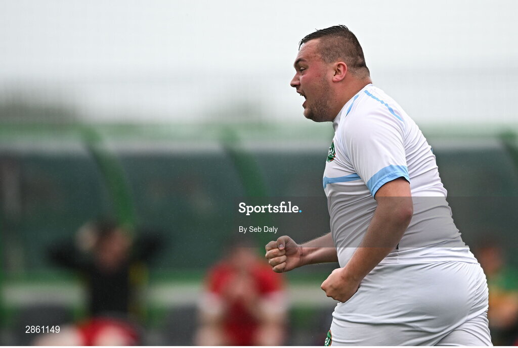 29 June 2024; Callum Kearns of Leinster celebrates scoring a goal during the FAI Football For All Interprovincial Games at Evergreen FC in Kilkenny. The FAI Football For All programme was initiated to assist and develop opportunities for players of all ages with a disability in their local community. Photo by Seb Daly/Sportsfile