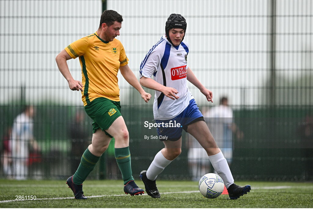 29 June 2024; Tadgh Hoey of Leinster North B in action against Adam Derwin of Leinster North A during the FAI Football For All Interprovincial Games at Evergreen FC in Kilkenny. The FAI Football For All programme was initiated to assist and develop opportunities for players of all ages with a disability in their local community. Photo by Seb Daly/Sportsfile