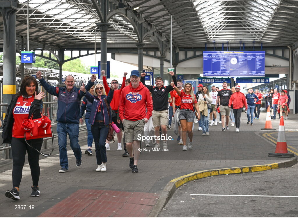 7 July 2024; Cork supporters arrive at Heuston train station on their way to the GAA Hurling All-Ireland Senior Championship semi-final match between Limerick and Cork at Croke Park in Dublin. Photo by Ray McManus/Sportsfile