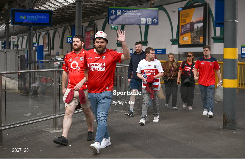 7 July 2024; Cork supporters arrive at Heuston train station on their way to the GAA Hurling All-Ireland Senior Championship semi-final match between Limerick and Cork at Croke Park in Dublin. Photo by Ray McManus/Sportsfile
