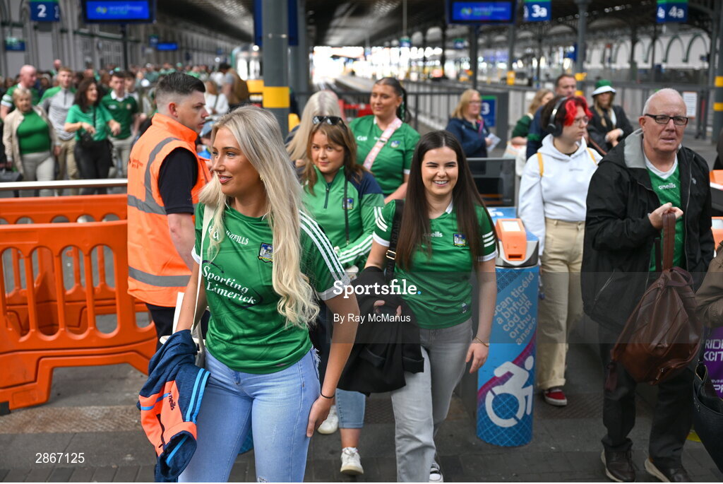 7 July 2024; Limerick supporters arrive at Heuston train station on their way to the GAA Hurling All-Ireland Senior Championship semi-final match between Limerick and Cork at Croke Park in Dublin. Photo by Ray McManus/Sportsfile