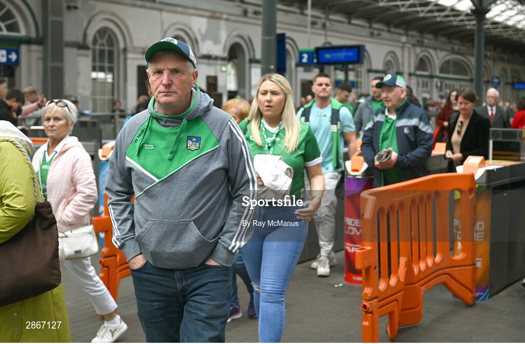 7 July 2024; Limerick supporters arrive at Heuston train station on their way to the GAA Hurling All-Ireland Senior Championship semi-final match between Limerick and Cork at Croke Park in Dublin. Photo by Ray McManus/Sportsfile