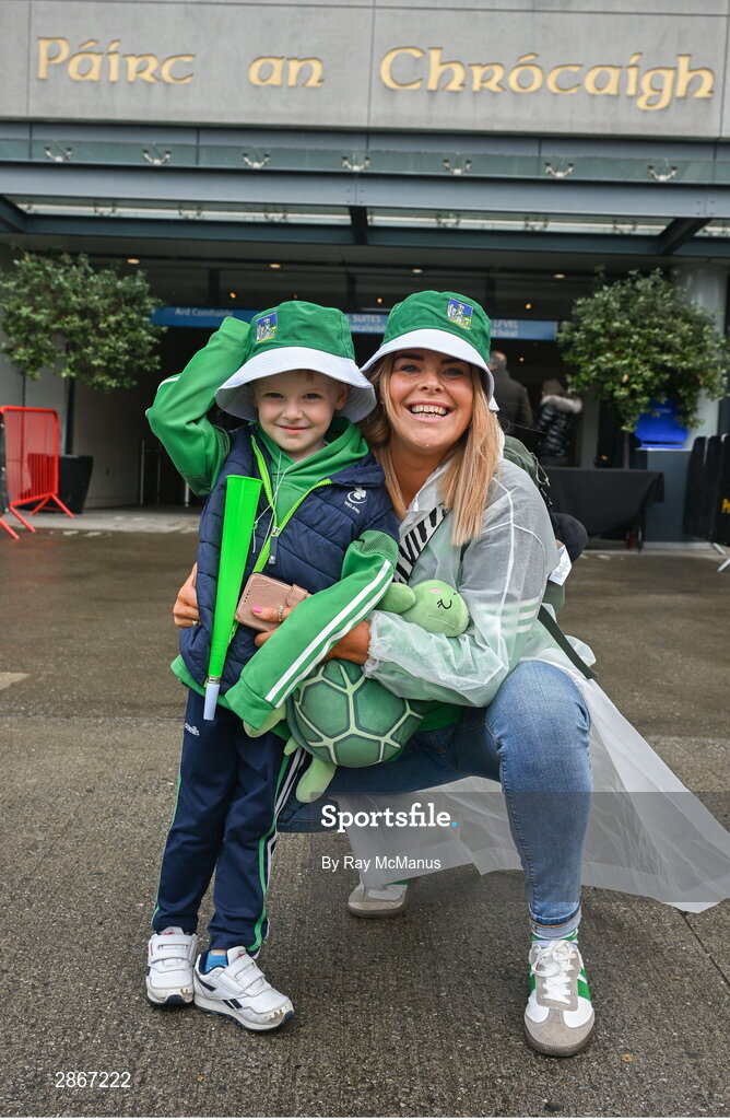 7 July 2024; Limerick supporters Billy O'Grady, aged four, and Jennifer O'Donnell, from Corbally, outside Croke Park before the GAA Hurling All-Ireland Senior Championship semi-final match between Limerick and Cork at Croke Park in Dublin. Photo by Ray McManus/Sportsfile