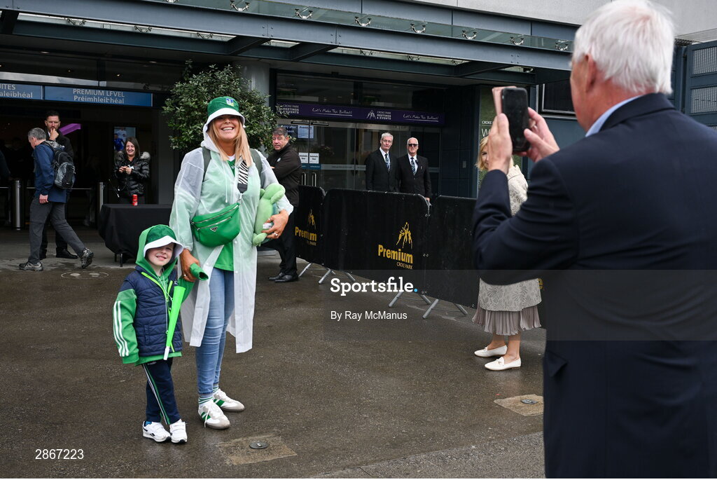 7 July 2024; Former GAA President Christy Cooney takes a picture of Limerick supporters Billy O'Grady, aged four, and Jennifer O'Donnell, from Corbally, outside Croke Park before the GAA Hurling All-Ireland Senior Championship semi-final match between Limerick and Cork at Croke Park in Dublin. Photo by Ray McManus/Sportsfile