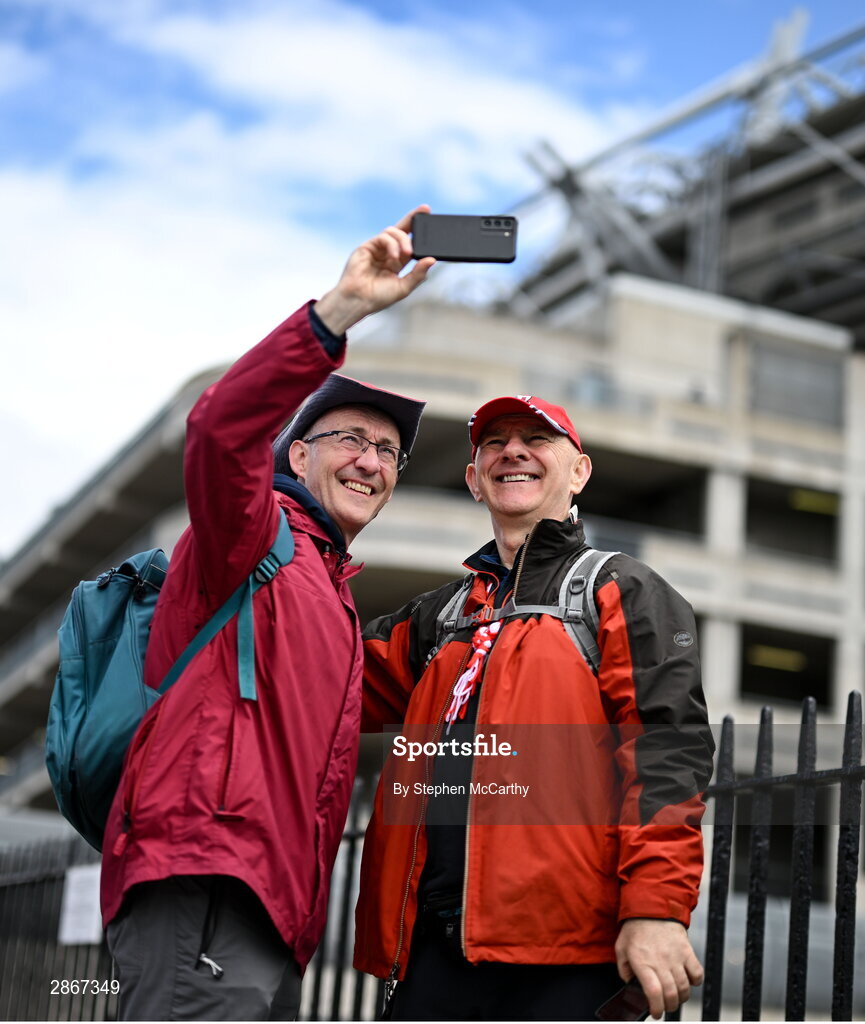 7 July 2024; Cork supporting brothers Brendan, from Carrigaline, and Jimmy Greally, from Bishopstown, pose for a photograph before the GAA Hurling All-Ireland Senior Championship semi-final match between Limerick and Cork at Croke Park in Dublin. Photo by Stephen McCarthy/Sportsfile