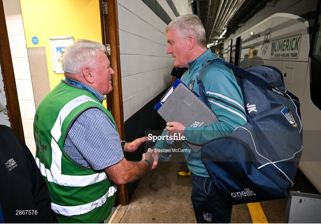 7 July 2024; Limerick manager John Kiely arrives for the GAA Hurling All-Ireland Senior Championship semi-final match between Limerick and Cork at Croke Park in Dublin. Photo by Stephen McCarthy/Sportsfile