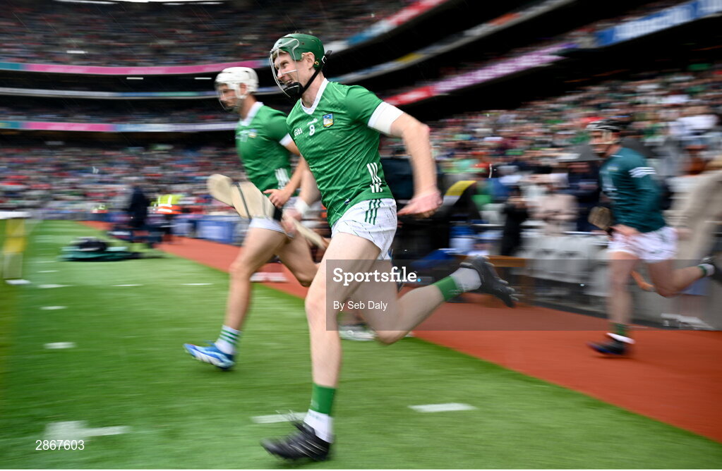 7 July 2024; Will O'Donoghue of Limerick runs out before the GAA Hurling All-Ireland Senior Championship semi-final match between Limerick and Cork at Croke Park in Dublin. Photo by Seb Daly/Sportsfile