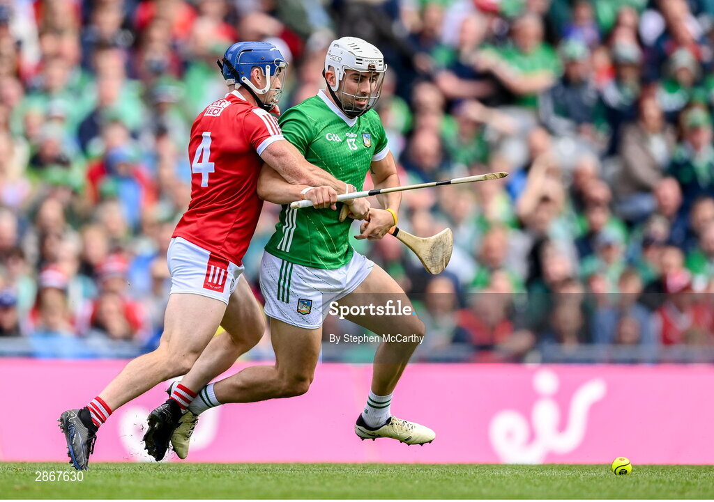 7 July 2024; Aaron Gillane of Limerick in action against Sean O'Donoghue of Cork during the GAA Hurling All-Ireland Senior Championship semi-final match between Limerick and Cork at Croke Park in Dublin. Photo by Stephen McCarthy/Sportsfile
