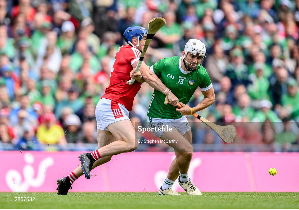 7 July 2024; Aaron Gillane of Limerick in action against Sean O'Donoghue of Cork during the GAA Hurling All-Ireland Senior Championship semi-final match between Limerick and Cork at Croke Park in Dublin. Photo by Stephen McCarthy/Sportsfile