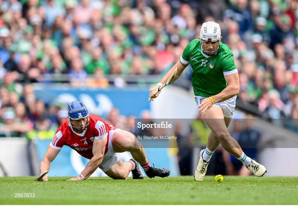 7 July 2024; Aaron Gillane of Limerick in action against Sean O'Donoghue of Cork during the GAA Hurling All-Ireland Senior Championship semi-final match between Limerick and Cork at Croke Park in Dublin. Photo by Stephen McCarthy/Sportsfile