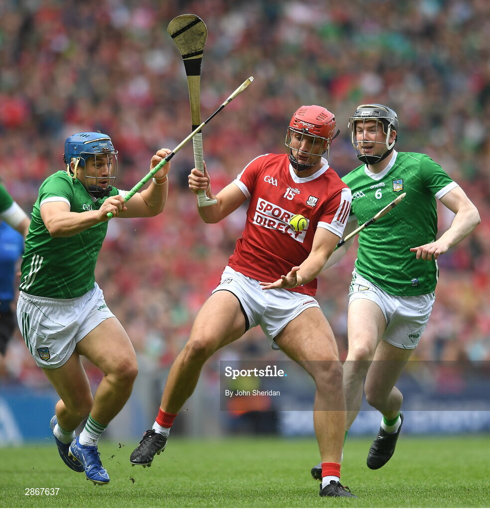 7 July 2024; Brian Hayes of Cork is tackled by Limerick players, Mike Casey, left, and Declan Hannon during the GAA Hurling All-Ireland Senior Championship semi-final match between Limerick and Cork at Croke Park in Dublin. Photo by John Sheridan/Sportsfile