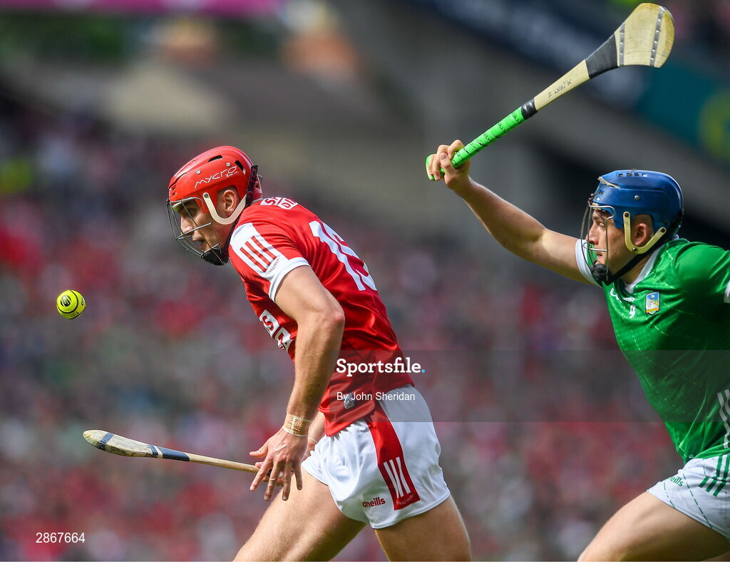 7 July 2024; Brian Hayes of Cork on his way to scoring his side's first goal despite the efforts of Mike Casey of Limerick during the GAA Hurling All-Ireland Senior Championship semi-final match between Limerick and Cork at Croke Park in Dublin. Photo by John Sheridan/Sportsfile