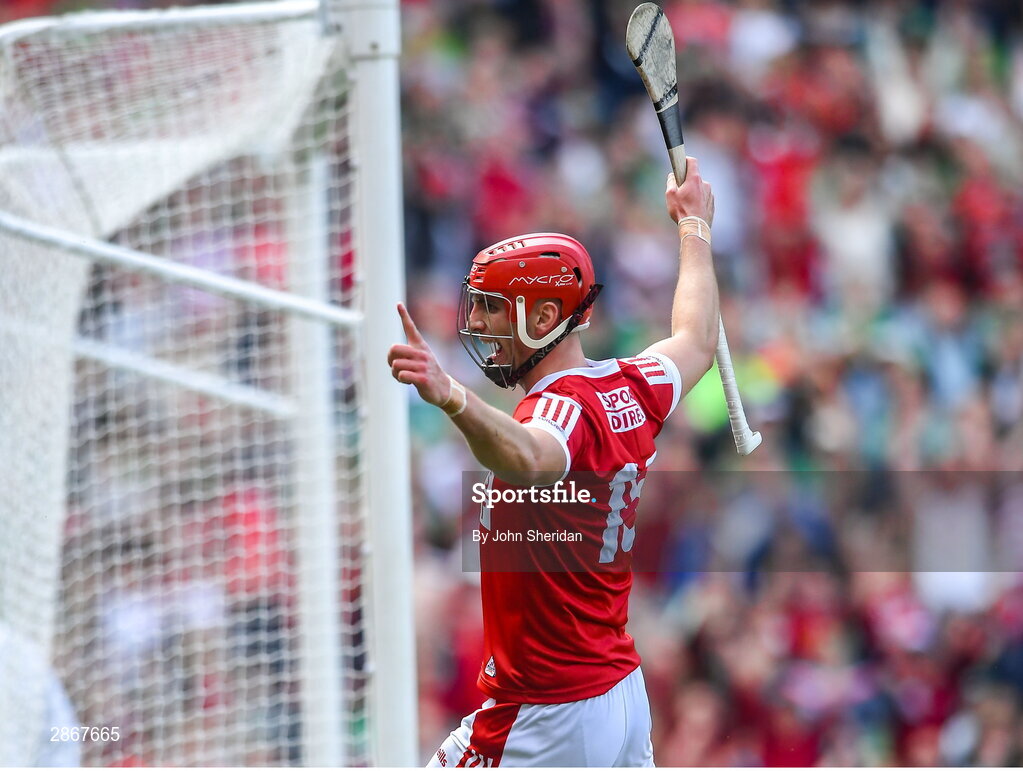 7 July 2024; Brian Hayes of Cork celebrates after scoring his side's first goal during the GAA Hurling All-Ireland Senior Championship semi-final match between Limerick and Cork at Croke Park in Dublin. Photo by John Sheridan/Sportsfile