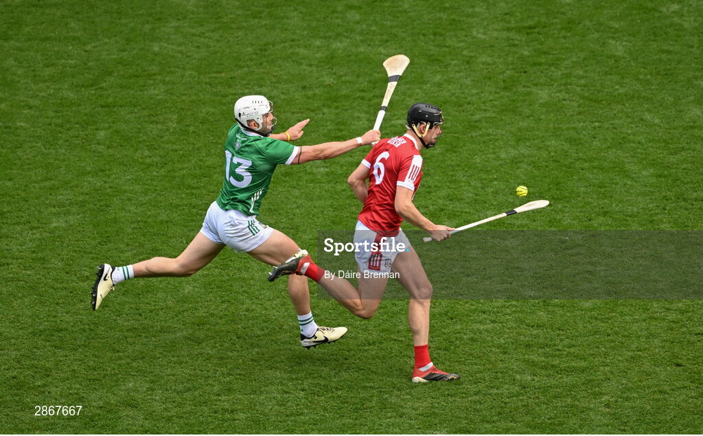 7 July 2024; Robert Downey of Cork in action against Aaron Gillane of Limerick during the GAA Hurling All-Ireland Senior Championship semi-final match between Limerick and Cork at Croke Park in Dublin. Photo by Daire Brennan/Sportsfile