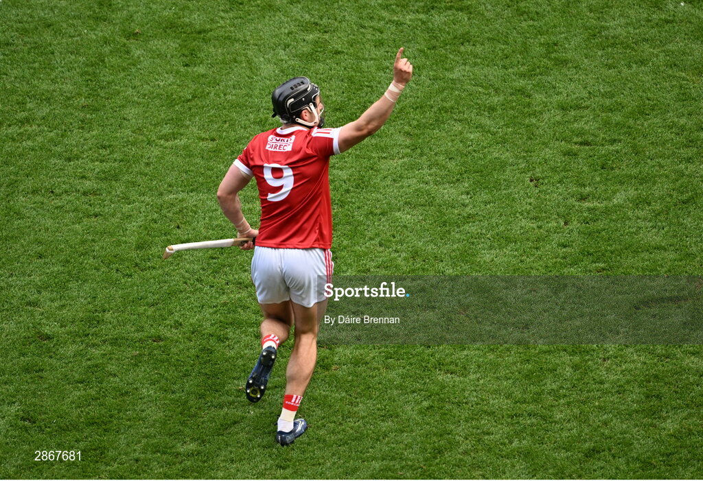 7 July 2024; Darragh Fitzgibbon of Cork celebrates after scoring a first half point during the GAA Hurling All-Ireland Senior Championship semi-final match between Limerick and Cork at Croke Park in Dublin. Photo by Daire Brennan/Sportsfile