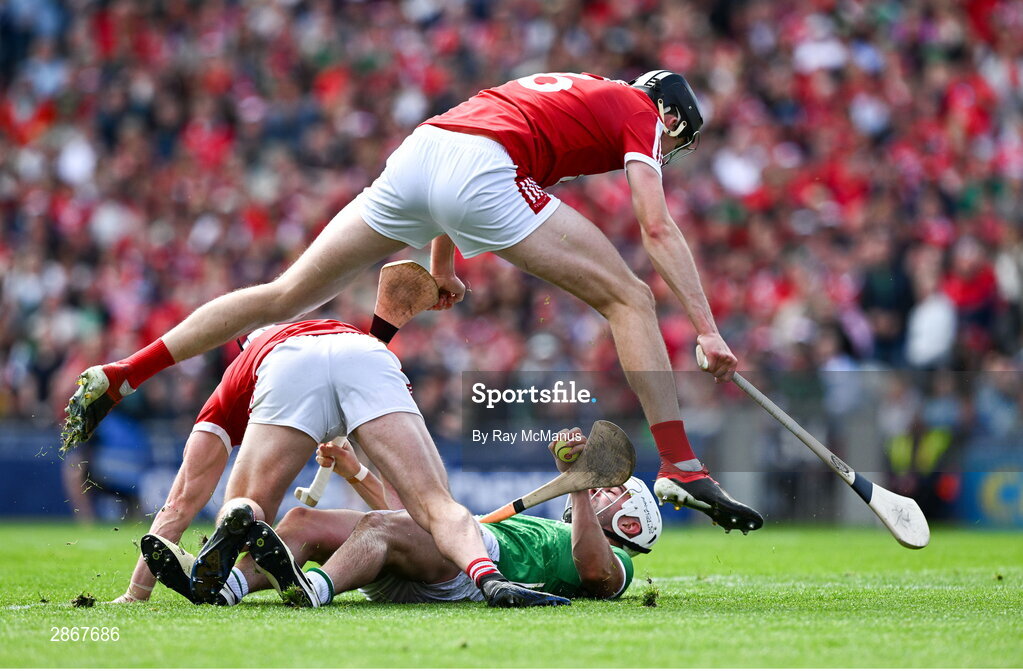 7 July 2024; Robert Downey of Cork jumps over Aaron Gillane of Limerick as he is tackled by Sean O Donoghue of Cork during the GAA Hurling All-Ireland Senior Championship semi-final match between Limerick and Cork at Croke Park in Dublin. Photo by Ray McManus/Sportsfile