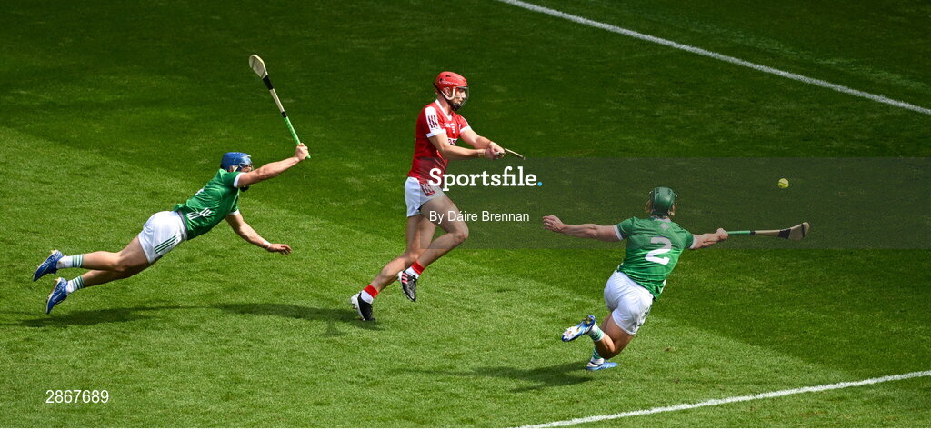 7 July 2024; Brian Hayes of Cork scores his side's first goal despite the challenge of Mike Casey, left, and Sean Finn of Limerick during the GAA Hurling All-Ireland Senior Championship semi-final match between Limerick and Cork at Croke Park in Dublin. Photo by Daire Brennan/Sportsfile