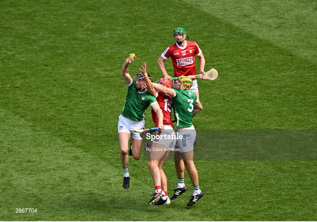 7 July 2024; Diarmaid Byrnes of Limerick in action against Brian Hayes of Cork during the GAA Hurling All-Ireland Senior Championship semi-final match between Limerick and Cork at Croke Park in Dublin. Photo by Daire Brennan/Sportsfile