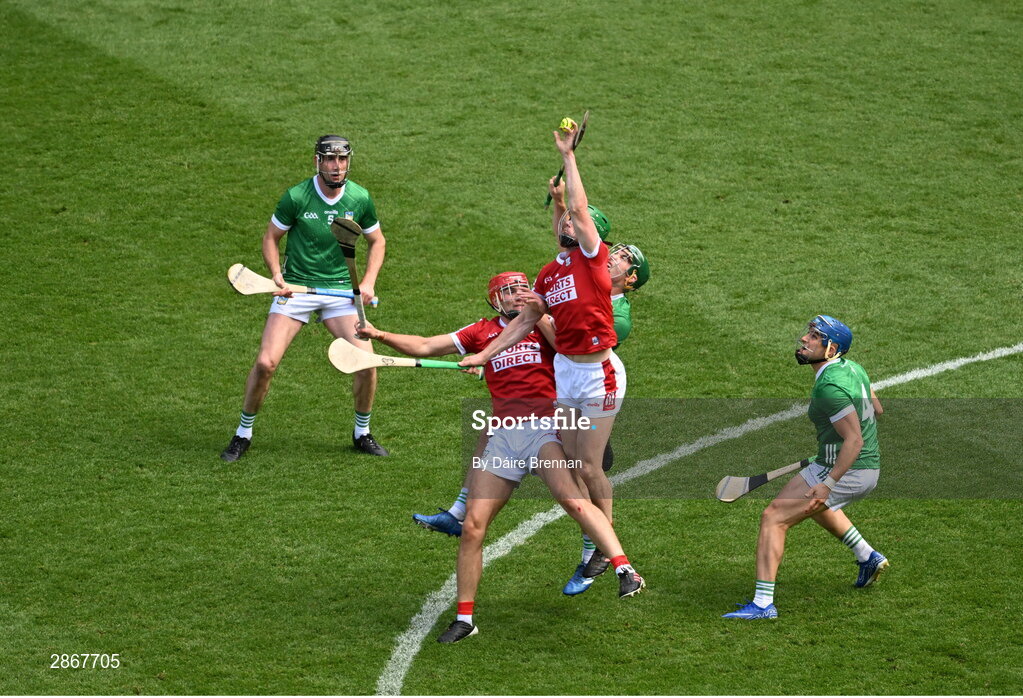 7 July 2024; Seamus Harnedy of Cork in action against Sean Finn of Limerick during the GAA Hurling All-Ireland Senior Championship semi-final match between Limerick and Cork at Croke Park in Dublin. Photo by Daire Brennan/Sportsfile