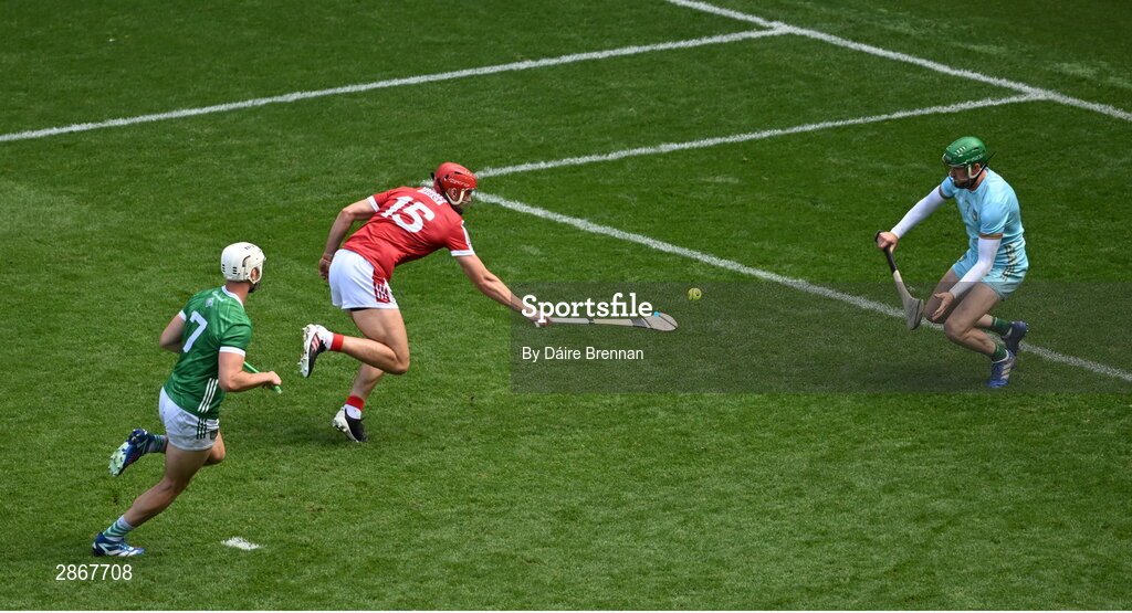 7 July 2024; Brian Hayes of Cork scores a point past Limerick goalkeeper Nickie Quaid during the GAA Hurling All-Ireland Senior Championship semi-final match between Limerick and Cork at Croke Park in Dublin. Photo by Daire Brennan/Sportsfile