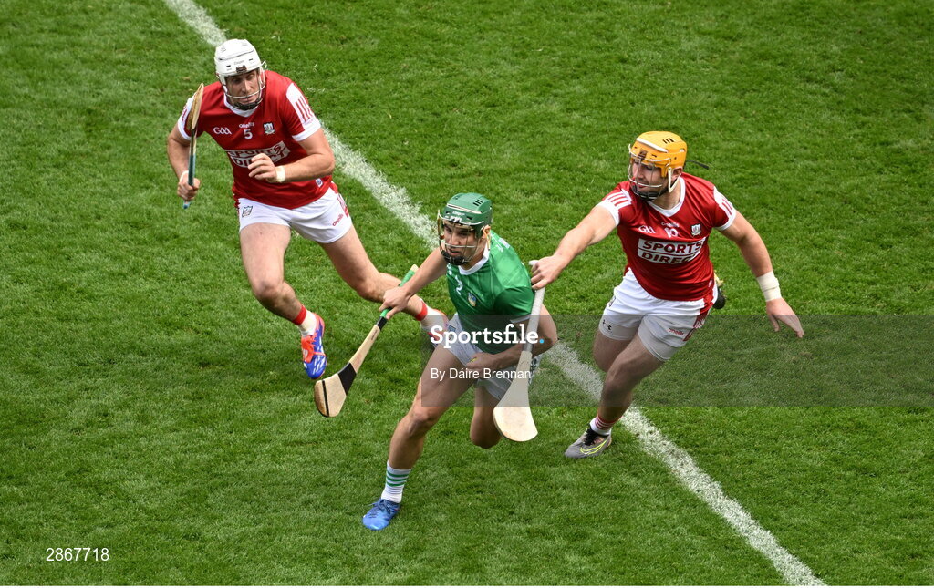 7 July 2024; Sean Finn of Limerick in action against Declan Dalton of Cork during the GAA Hurling All-Ireland Senior Championship semi-final match between Limerick and Cork at Croke Park in Dublin. Photo by Daire Brennan/Sportsfile
