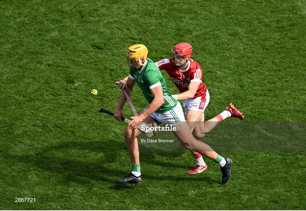 7 July 2024; Cathal O'Neill of Limerick in action against Alan Connolly of Cork during the GAA Hurling All-Ireland Senior Championship semi-final match between Limerick and Cork at Croke Park in Dublin. Photo by Daire Brennan/Sportsfile