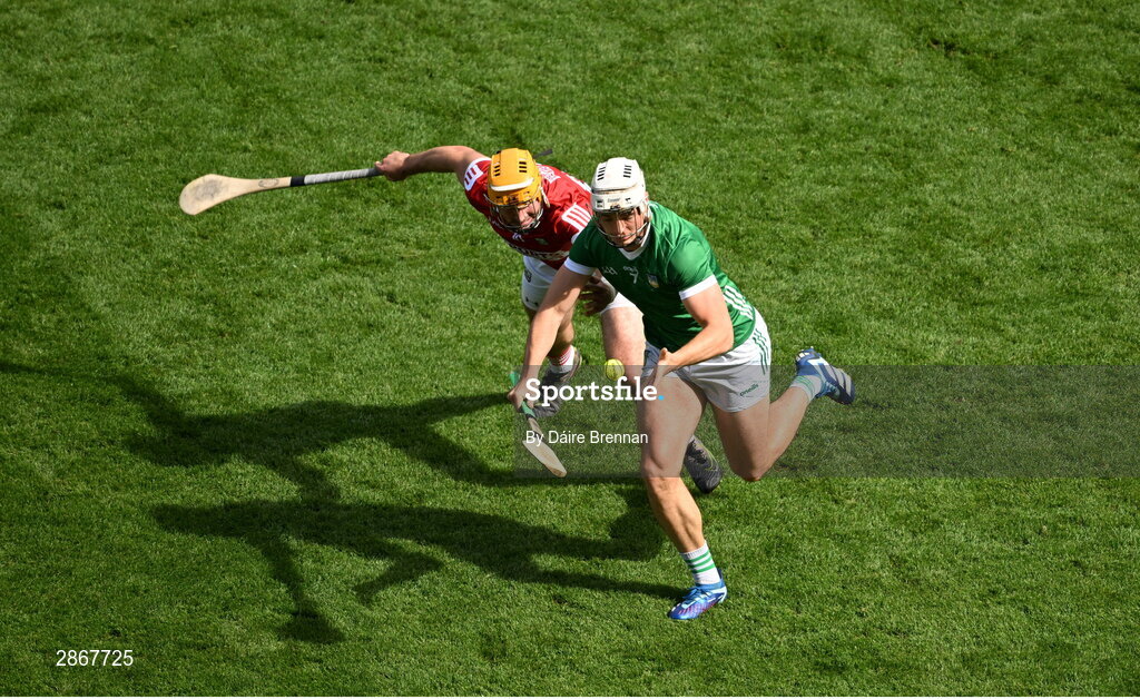 7 July 2024; Kyle Hayes of Limerick in action against Declan Dalton of Cork during the GAA Hurling All-Ireland Senior Championship semi-final match between Limerick and Cork at Croke Park in Dublin. Photo by Daire Brennan/Sportsfile