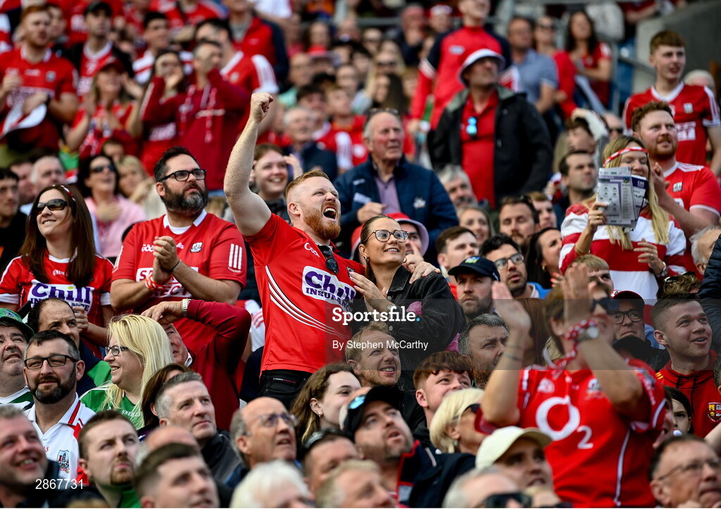 7 July 2024; Cork supporters celebrate during the GAA Hurling All-Ireland Senior Championship semi-final match between Limerick and Cork at Croke Park in Dublin. Photo by Stephen McCarthy/Sportsfile