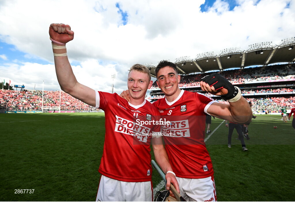 7 July 2024; Shane Barrett, left, and Ciarán Joyce of Cork celebrate after the GAA Hurling All-Ireland Senior Championship semi-final match between Limerick and Cork at Croke Park in Dublin. Photo by Stephen McCarthy/Sportsfile