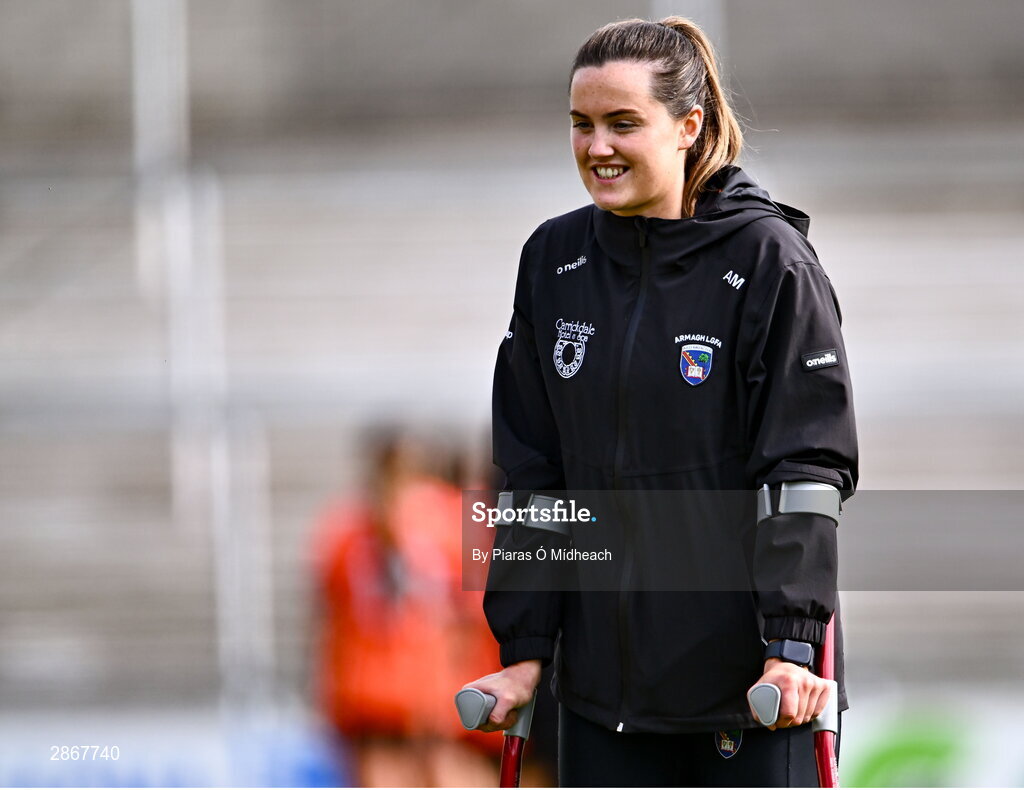 7 July 2024; Injured Armagh footballer Aimee Mackin before the TG4 All-Ireland Ladies Football Senior Championship quarter-final match between Armagh and Mayo at the BOX-IT Athletic Grounds in Armagh. Photo by Piaras Ó Mídheach/Sportsfile