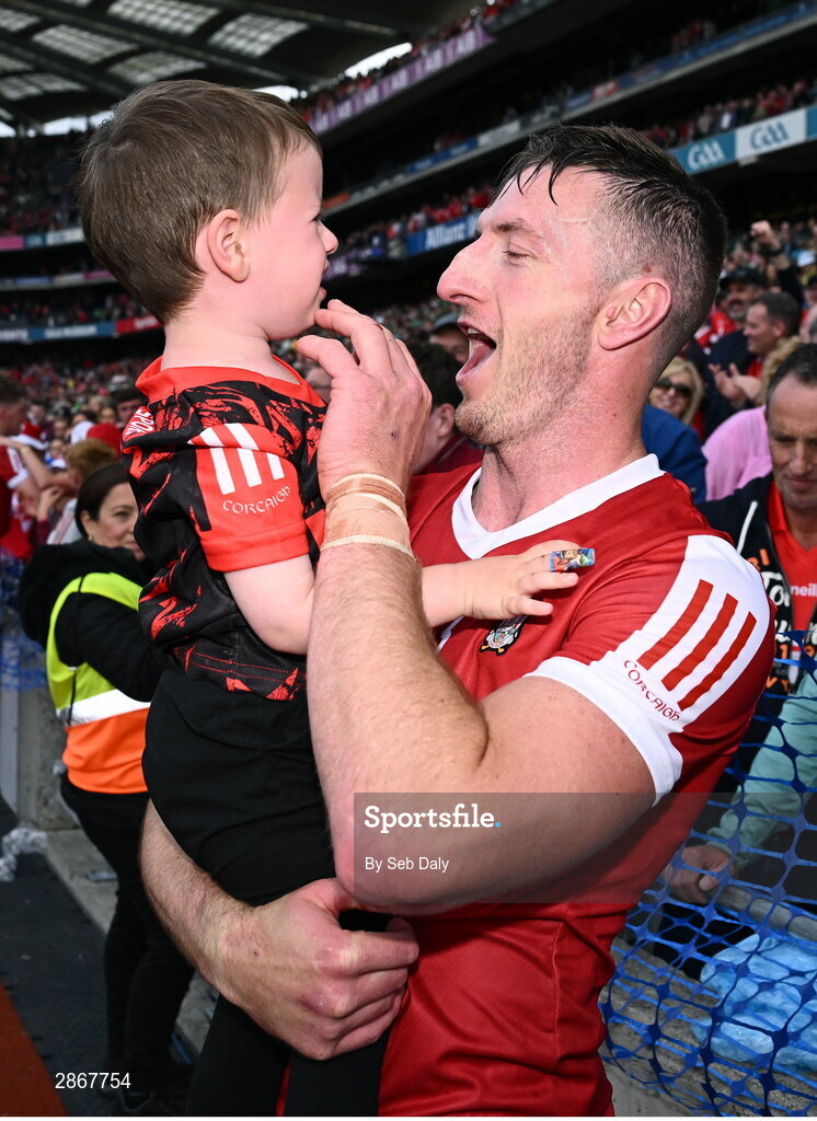 7 July 2024; Patrick Horgan of Cork celebrates with his son Jack after his side's victory in the GAA Hurling All-Ireland Senior Championship semi-final match between Limerick and Cork at Croke Park in Dublin. Photo by Seb Daly/Sportsfile