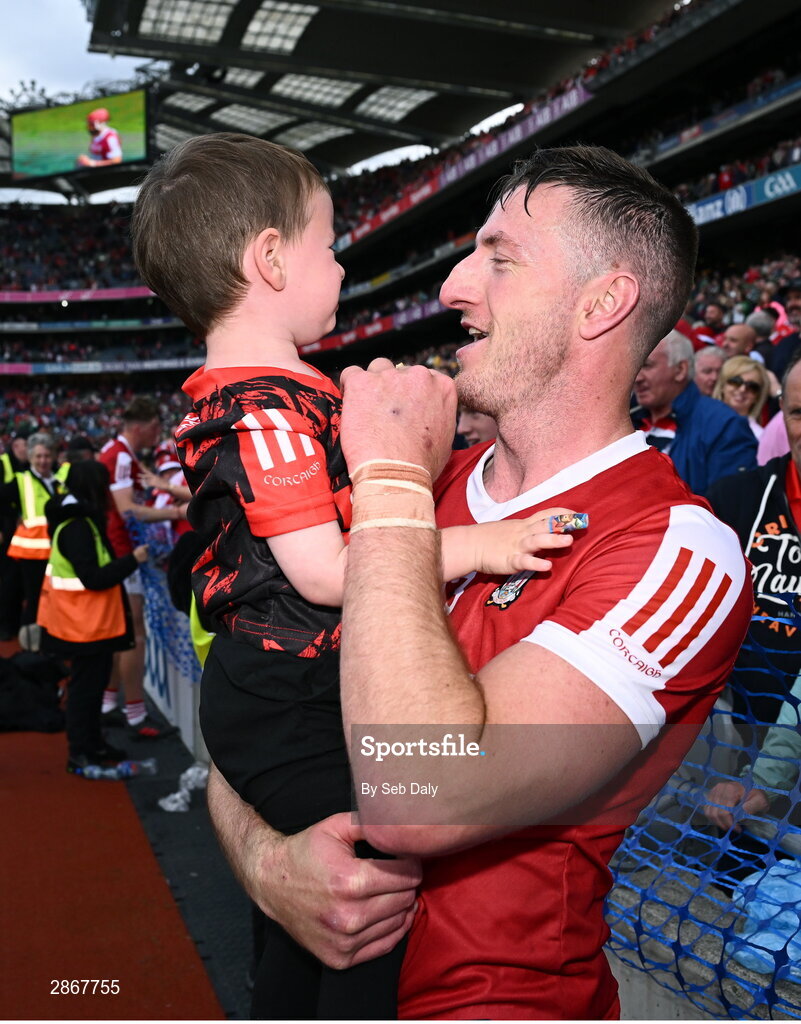 7 July 2024; Patrick Horgan of Cork celebrates with his son Jack after his side's victory in the GAA Hurling All-Ireland Senior Championship semi-final match between Limerick and Cork at Croke Park in Dublin. Photo by Seb Daly/Sportsfile