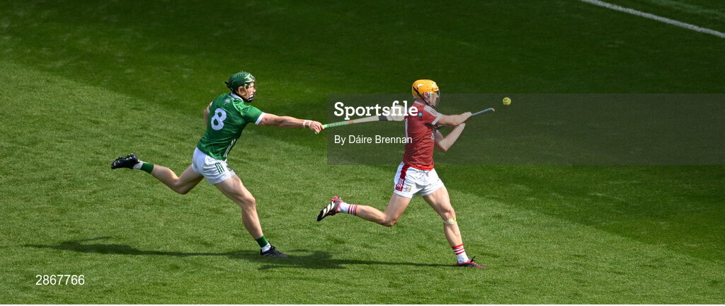 7 July 2024; Shane Barrett of Cork in action against Will O'Donoghue of Limerick during the GAA Hurling All-Ireland Senior Championship semi-final match between Limerick and Cork at Croke Park in Dublin. Photo by Daire Brennan/Sportsfile