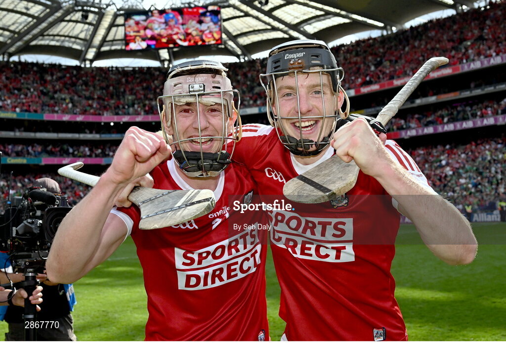 7 July 2024; Cork players Ethan Twomey, left, and Eoin Downey celebrate after their side's victory in the GAA Hurling All-Ireland Senior Championship semi-final match between Limerick and Cork at Croke Park in Dublin. Photo by Seb Daly/Sportsfile