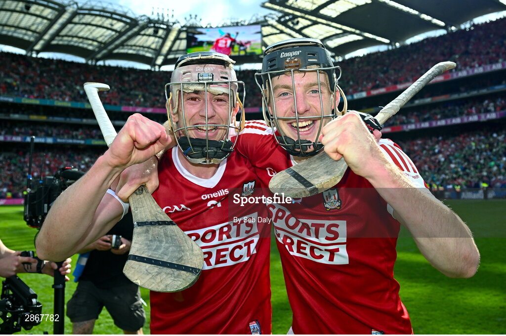 7 July 2024; Cork players Ethan Twomey, left, and Eoin Downey celebrate after their side's victory in the GAA Hurling All-Ireland Senior Championship semi-final match between Limerick and Cork at Croke Park in Dublin. Photo by Seb Daly/Sportsfile