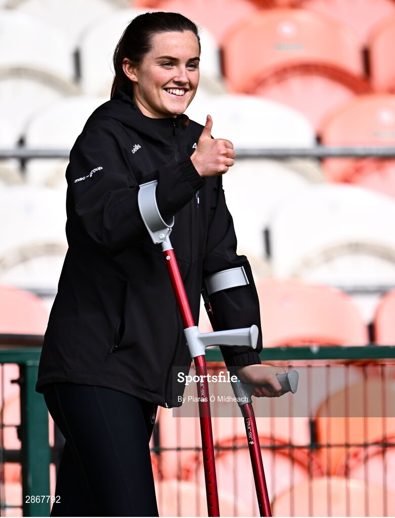 7 July 2024; Injured Armagh footballer Aimee Mackin before the TG4 All-Ireland Ladies Football Senior Championship quarter-final match between Armagh and Mayo at the BOX-IT Athletic Grounds in Armagh. Photo by Piaras Ó Mídheach/Sportsfile
