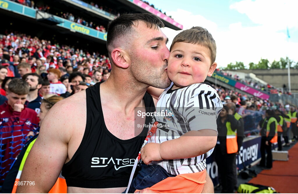 7 July 2024; Declan Dalton of Cork with his 19 month old son DJ after the GAA Hurling All-Ireland Senior Championship semi-final match between Limerick and Cork at Croke Park in Dublin. Photo by Ray McManus/Sportsfile
