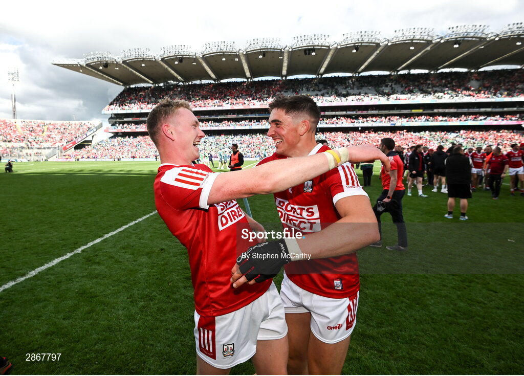 7 July 2024; Shane Barrett, left, and Ciarán Joyce of Cork celebrate after the GAA Hurling All-Ireland Senior Championship semi-final match between Limerick and Cork at Croke Park in Dublin. Photo by Stephen McCarthy/Sportsfile