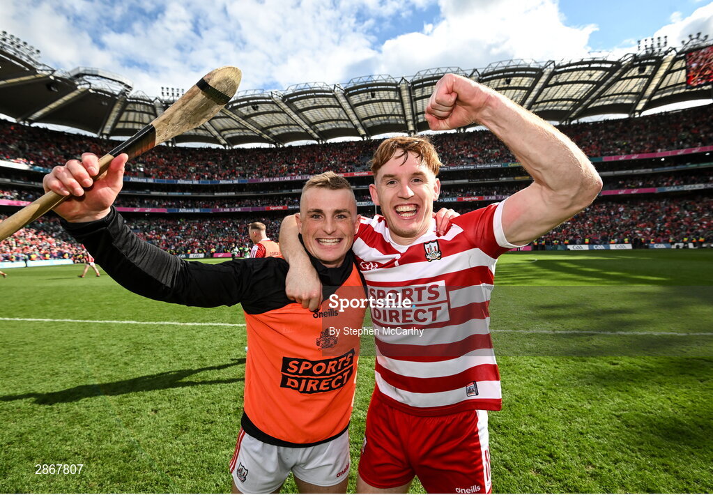 7 July 2024; Cork's Tommy O'Connell, left, and Patrick Collins celebrate after the GAA Hurling All-Ireland Senior Championship semi-final match between Limerick and Cork at Croke Park in Dublin. Photo by Stephen McCarthy/Sportsfile
