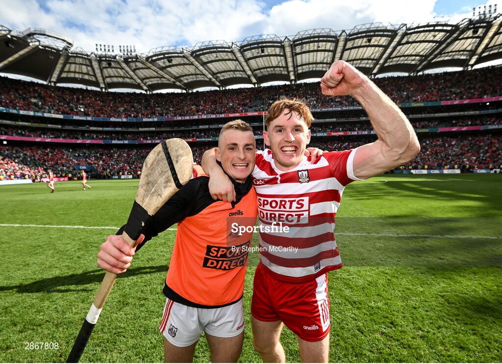 7 July 2024; Cork's Tommy O'Connell, left, and Patrick Collins celebrate after the GAA Hurling All-Ireland Senior Championship semi-final match between Limerick and Cork at Croke Park in Dublin. Photo by Stephen McCarthy/Sportsfile