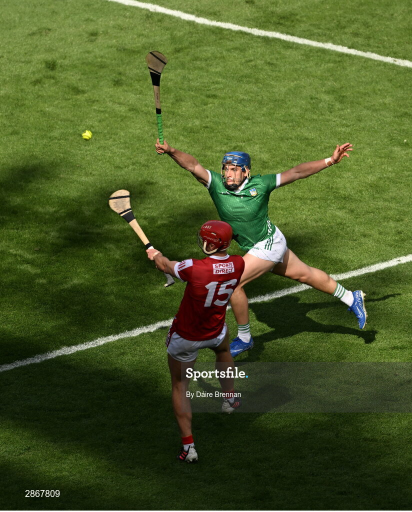 7 July 2024; Brian Hayes of Cork scores a point despite the challenge of Mike Casey of Limerick during the GAA Hurling All-Ireland Senior Championship semi-final match between Limerick and Cork at Croke Park in Dublin. Photo by Daire Brennan/Sportsfile
