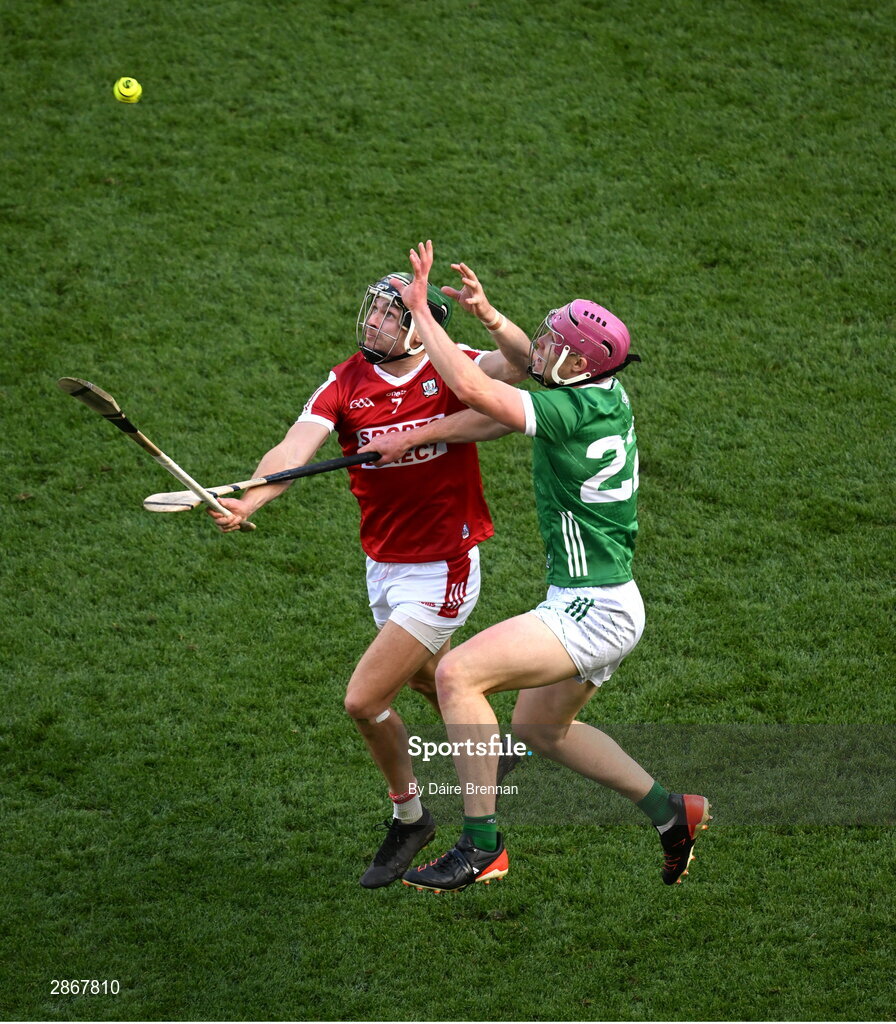 7 July 2024; Mark Coleman of Cork in action against Shane O'Brien of Limerick during the GAA Hurling All-Ireland Senior Championship semi-final match between Limerick and Cork at Croke Park in Dublin. Photo by Daire Brennan/Sportsfile