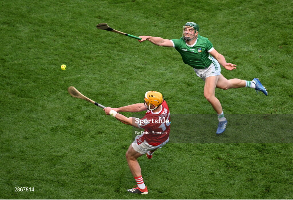 7 July 2024; Declan Dalton of Cork in action against Sean Finn of Limerick during the GAA Hurling All-Ireland Senior Championship semi-final match between Limerick and Cork at Croke Park in Dublin. Photo by Daire Brennan/Sportsfile